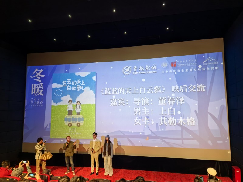 以蒙古族文化为背景,展现了草原辽阔风貌的影片《蓝蓝的天上白云飘》,用湖南嘻哈小伙儿和内蒙女孩双向奔赴的温暖故事,展现了中国文艺电影的多元魅力。对导演董春泽而言,影片是对“真实地去向往生活,追寻生活”这个反向励志题眼的具象表达,希望以平凡日常的“小确幸”传递治愈力量。映后交流中,男主角上白笑称拍摄过程充满“痛苦却激情”的回忆,草原上“最尴尬”的经历成为了他职业生涯中最难忘的记忆。女主角其勒木格则惊喜地发现,拍摄地竟距离家乡仅半小时步程,近乎本色出演的她更化身剧组“翻译官”,架起创作团队与牧民沟通的桥梁。主创们对剧中情感的生动延展,令现场观众怦然心动,感受到青春与自然的诗意联结。
