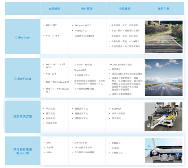 挡风玻璃 HUD(W-HUD)解决方案 —— 旗舰产品为 CyberLens 系列,透过精密的光学投射技术将行车资讯虚拟显示于挡风玻璃前,已实现大规模量产。