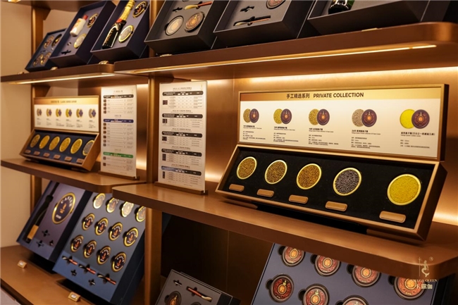 店内多处陈设是鱼子酱叙事的延伸。步入室内,宾客可欣赏到卡露伽全系列鱼子酱产品,体会卡露伽的生活美学态度。不同年份的鱼子酱依次排开,以及鱼子酱为灵感制作的马卡龙、巧克力等多款单品。在时间的加持下,一颗颗鱼卵幻化成触手可及的美味。